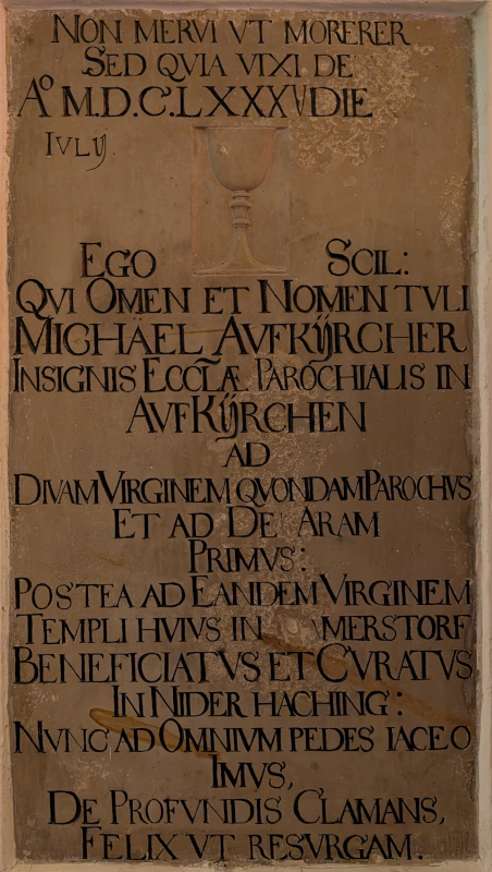 (Bild eines Kelches – Symbol für das Priestertum) EGO SCIL[ICET]: QVI OMEN ET NOMEN TVLI MICHAEL AVFKIRCHER INSIGNIS ECCL[ESI]AE PAROCHIALIS IN AVFKIRCHEN AD DIVAM VIRGINEM QVONDAM PAROCHVS ET AD DEI ARAM PRIMVS: POSTEA AD EANDEM VIRGINEM TEMPLI HVIVS IN RAMERSTORF BENEFICIATVS ET CVRATVS IN NIDER HACHING: NVNC AD OMNIVM PEDES IACEO IMVS, DE PROFVNDIS CLAMANS, FELIX VT RESVRGAM.