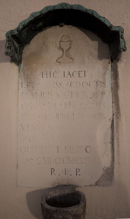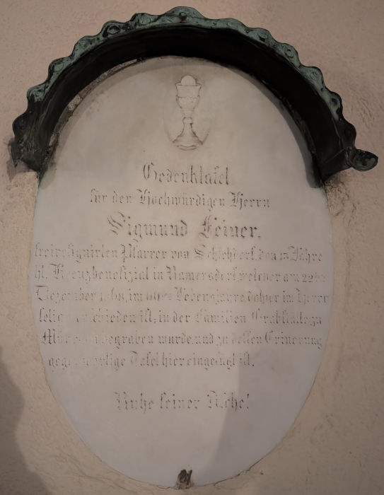 Diese Gedenktafel befindet sich ebenfalls an der nördlichen Seitenwand der Kirche, vor dem Eingang. Sie ist für einen katholischen Geistlichen. Die Inschrift ist in einer kunstvollen Schreibschrift (einer Variante der Fraktur) verfasst. Hier ist die Transkription des Textes: