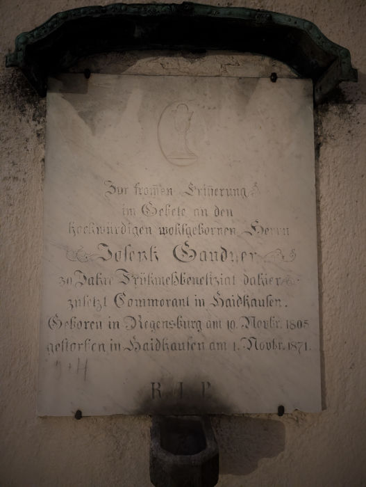 Die Tafel erinnert an Joseph Sandner (1805–1871), der drei Jahrzehnte lang als Priester in der Gemeinde Maria Ramersdorf tätig war und kurz vor seinem 66. Geburtstag in Haidhausen verstarb.