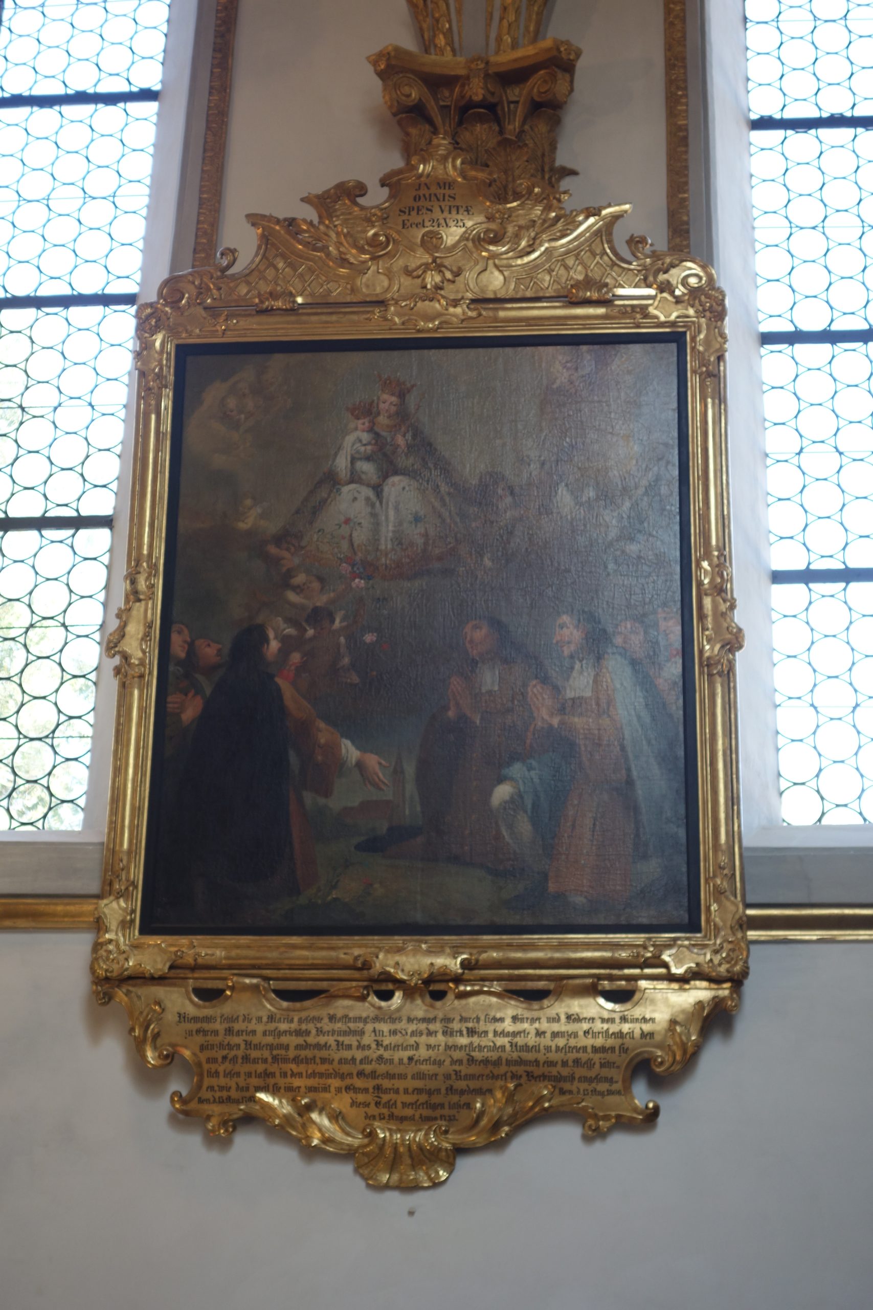 Niemahls fehlet die zu Maria gesetzte Hoffnung. Solches bezeuget eine durch sieben Bürger und Loderer von München zu Ehren Marien aufgerichtete Verbündniß. An. 1683 als der Türk Wien belagerte, der ganzen Christenheit den gänzlichen Untergang androhete. Um das Vaterland vor bevorstehenden Unheil zu befreien, haben sie am Fest Maria Him[m]elfahrt, wie auch alle Son[n] u. Feiertage den Dreißigst hindurch eine hl. Messe jährlich lesen zu laßen in den lobwürdigen Gotteshaus allhier zu Ramersdorf die Verbündniß angefangen, wie dan[n] weil sie im[m]er zunim[m]t zu Ehren Maria u. ewigen Angedenken diese Tafel verfertigen laßen,