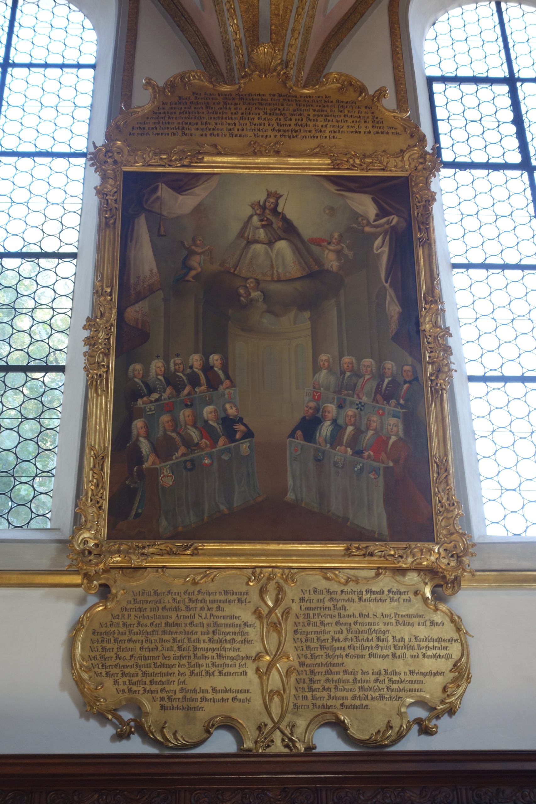 Von denen hinach Specificierten 20 Personen, welche von der Kaisl. Residenz-Stadt München den 6ten Ocktober An. 1742 beim Abmarsch der feindlich Oesterreich und Hungar Völker Nachtszeit in den Häusertn ausgehebt, folglich als Geiseln abweg und nach Linz, endlich aber auf Gratz gefänglich geführet worden, die dan wie sie es in damahligen gefährlichen Zeitläufen und mißlichen Umständen verlobt, in gegenwärtigen Gotteshaus Ramersdorf der gebenedeijtesten, jungfräulichen Mutter Gottes ein Lob und Dank-Amt halten, auch die Tafel malen und hieher aufhangen laßen, weil durch dero Vorbilt, die Herren Geiseln bis auf einzige zwei, so zu Gratz verstorben, nach dreivierteljährig ausgestandener hart und betrübtester Gefangenschaft, beim Leben erhalten worde und glücklich wieder zurück kommen sind. Darum nach Gott die Himmels-Königin in Ewigkeit gepriesen sein solle.