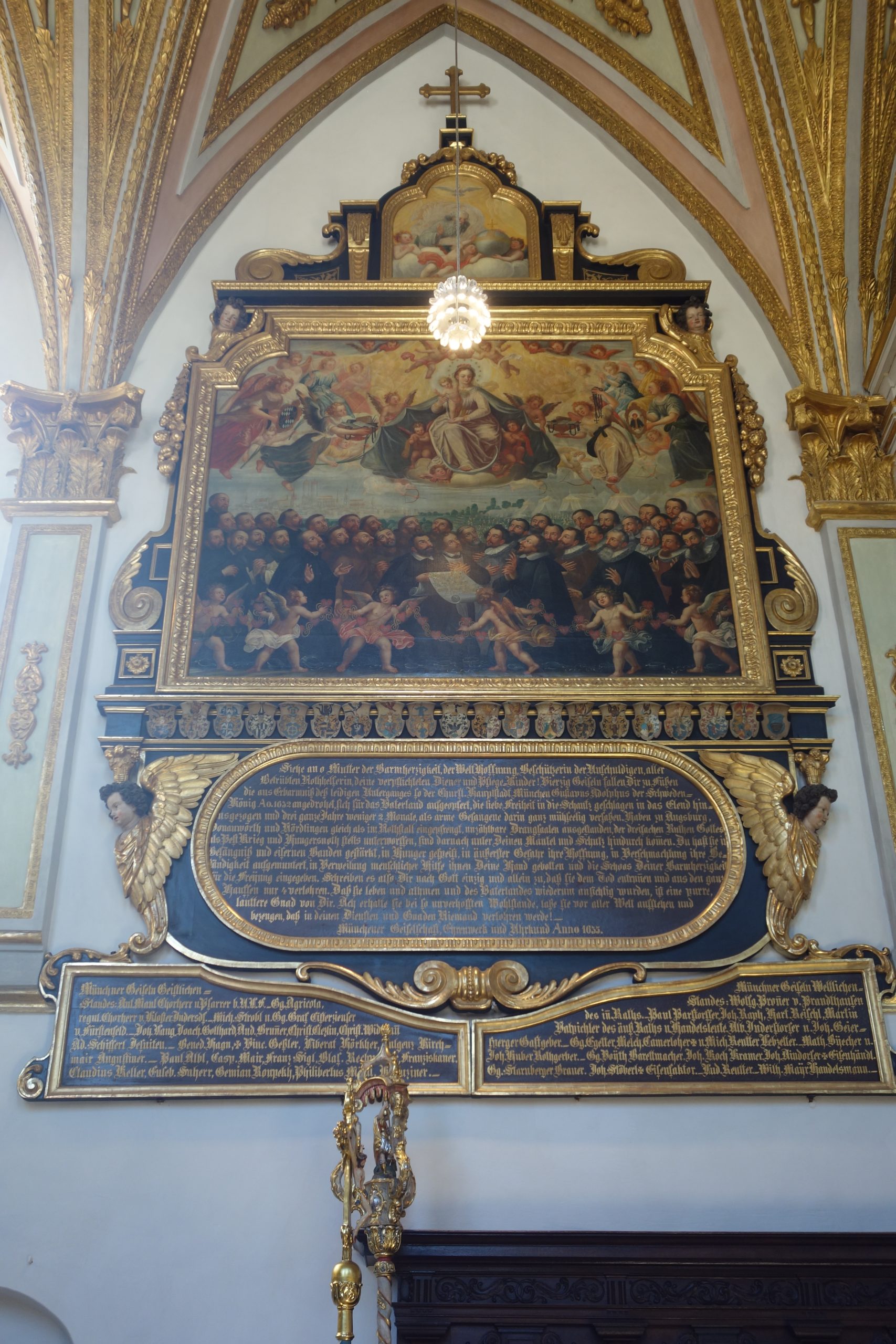 Die älteste, zugleich größte und prunkvollste von ihnen ist die der Schwedengeiseln. Als der Schwedenkönig Gustav Adolf im Mai 1632, also während des Dreißigjährigen Krieges, mit seinem Heer vor München stand, bot man ihm die kampflose Übergabe der Stadt an. Diese nahm er an und erklärte sich bereit, die Stadt gegen eine Zahlung von 300.000 Reichstalern vor Plünderung und Zerstörung zu verschonen. Weil die Stadt nicht annähernd so viel Geld aufbringen konnte, musste sie letztlich 42 Geiseln (22 geistlichen und 20 weltlichen Standes) als Bürgschaft stellen, die in das von den Schweden besetzte Augsburg gebracht wurden.